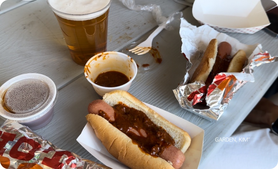 칠리 핫도그 2개랑 친구가 마실 맥주 이렇게 주문했다.